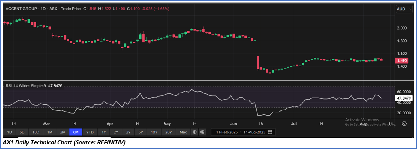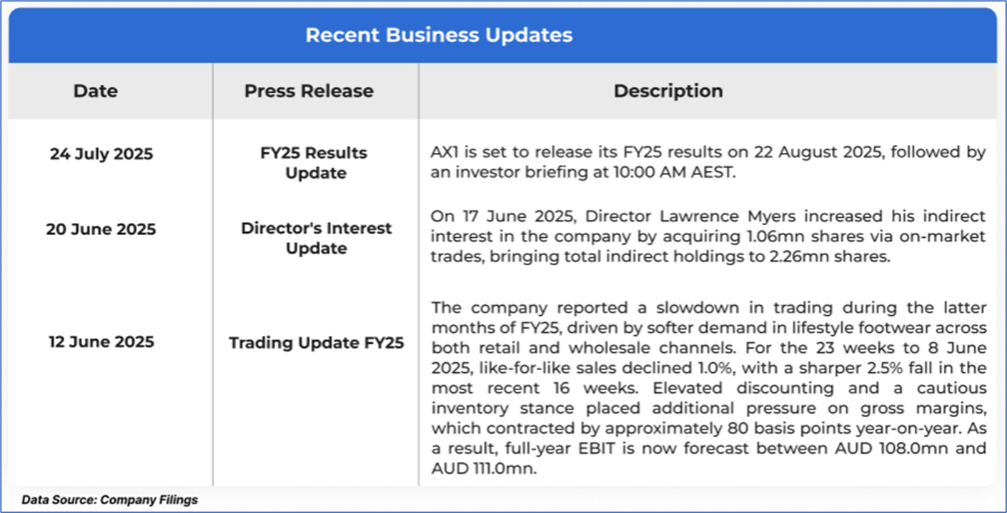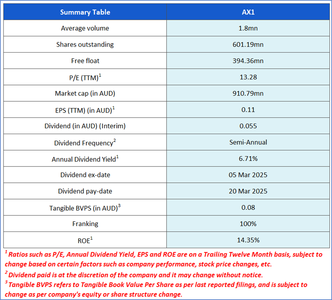 The stock price has gone down by ~1.32% in the last one month and over the last six months, stock prices declined by ~28.37%. The stock has a 52-week low and 52-week high of AUD 1.280 and AUD 2.660, respectively, and is currently trading below the average of the 52-week-high-low levels. AX1 was last covered in a report dated ’14 July 2025’.