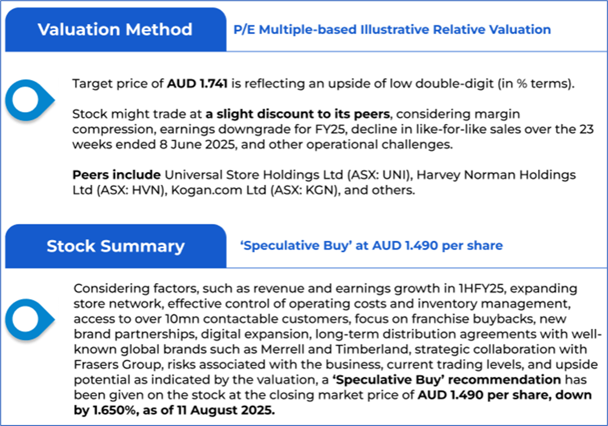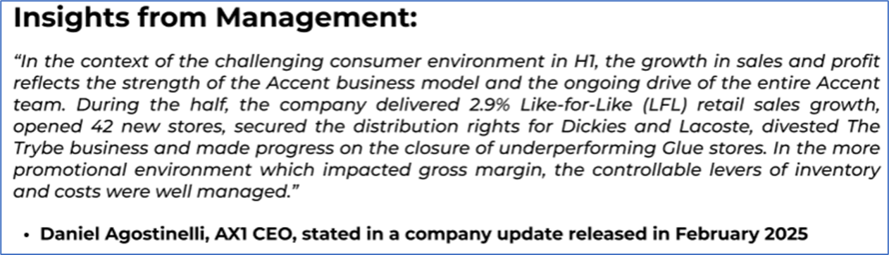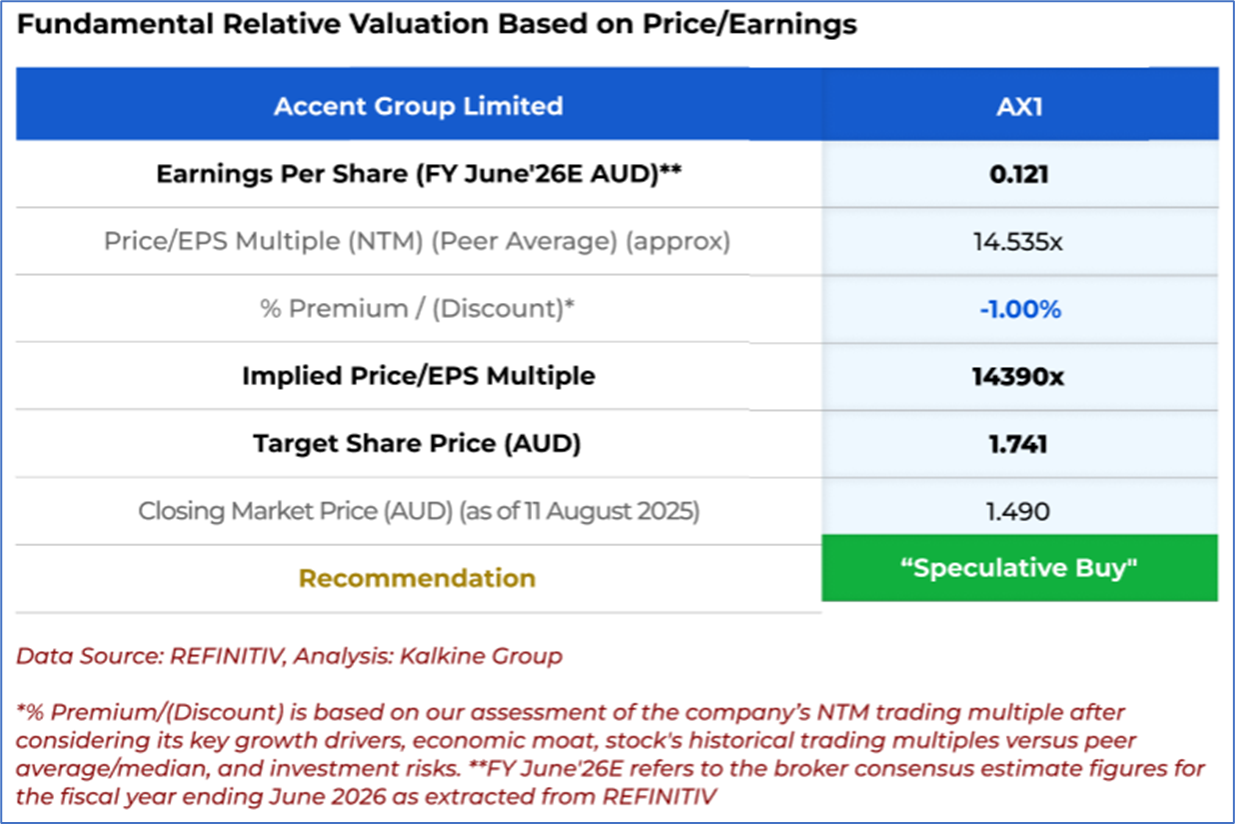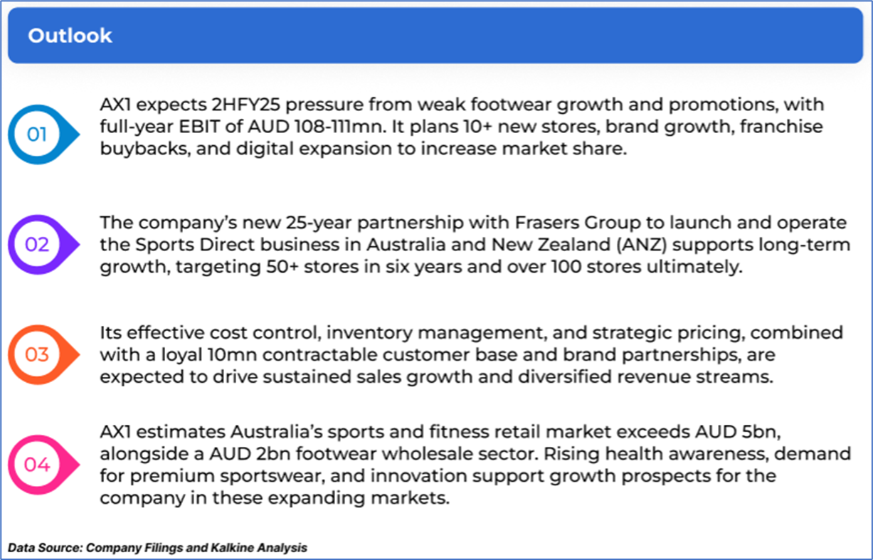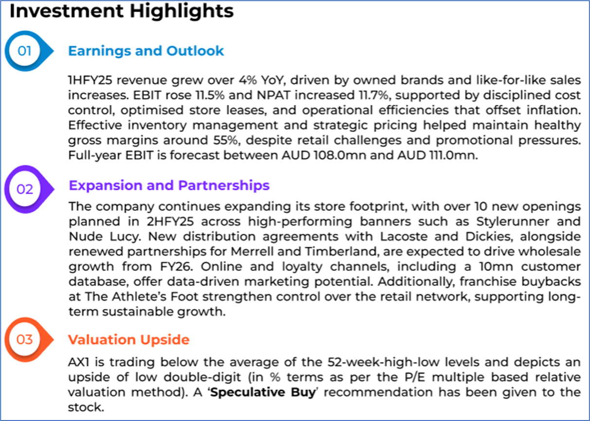 1.1: Company Overview: Accent Group Limited (ASX: AX1) is a digitally integrated retailer and distributor of branded performance and lifestyle footwear, apparel, and accessories. The company operates over 900 stores across 20 retail banners in Australia and New Zealand, with exclusive distribution rights for 14 international brands. Its brand portfolio includes owned and licensed names such as The Athlete’s Foot, Skechers, Vans, Dr. Martens, and Merrell. Kalkine’s Investor Report covers the Investment Highlights, Management Insights, Key Financial Metrics, Risks, Technical Analysis along with the Valuation, Target Price, and Recommendation on the stock.