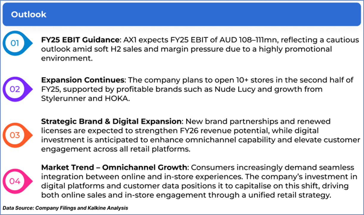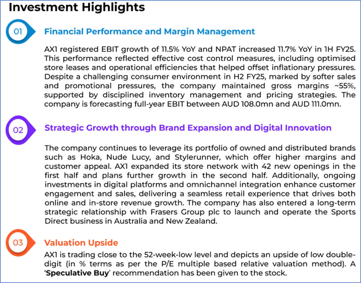 1.1: Company Overview: Accent Group Limited (ASX: AX1) is a digitally integrated retailer and distributor of branded performance and lifestyle footwear, apparel, and accessories. The company operates over 900 stores across 20 retail banners in Australia and New Zealand, with exclusive distribution rights for 14 international brands. Its brand portfolio includes owned and licensed names such as The Athlete’s Foot, Skechers, Vans, Dr. Martens, and Merrell. Kalkine’s Investor Report covers the Investment Highlights, Management Insights, Key Financial Metrics, Risks, Technical Analysis along with the Valuation, Target Price, and Recommendation on the stock.