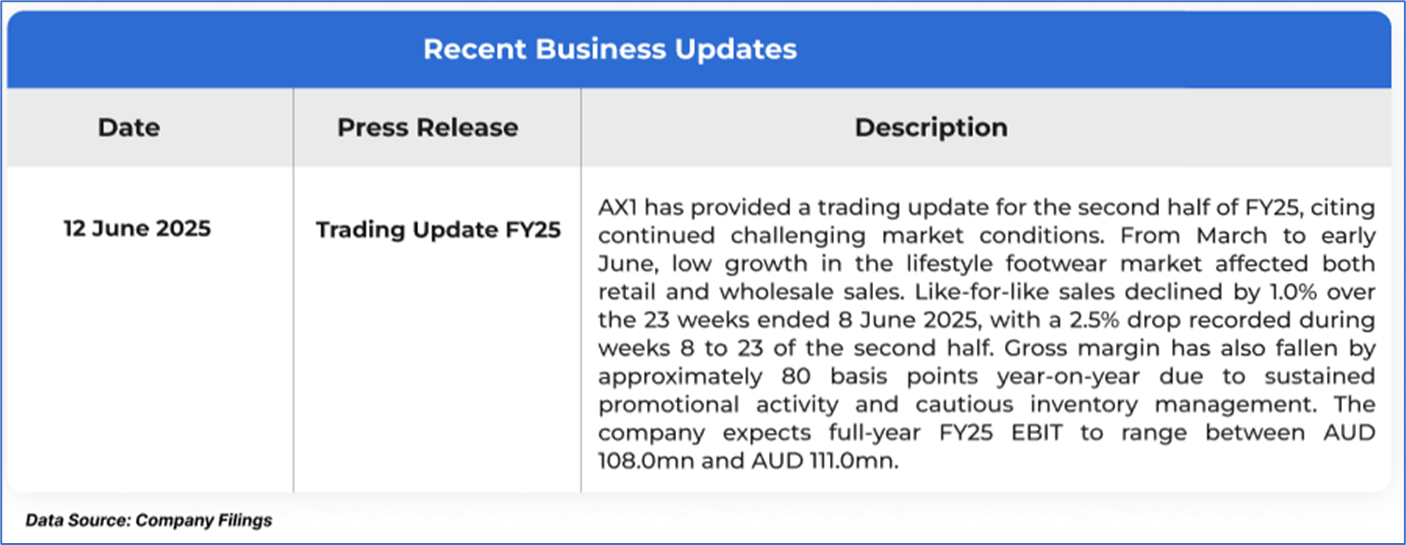 The stock price has gone down by ~29.85% in the last one month and over the last six months, stock prices declined by ~39.69%. The stock has a 52-week low and 52-week high of AUD 1.330 and AUD 2.660, respectively, and is currently trading close to the 52-week-low level. AX1 was last covered in a report dated ‘12 May 2025’.