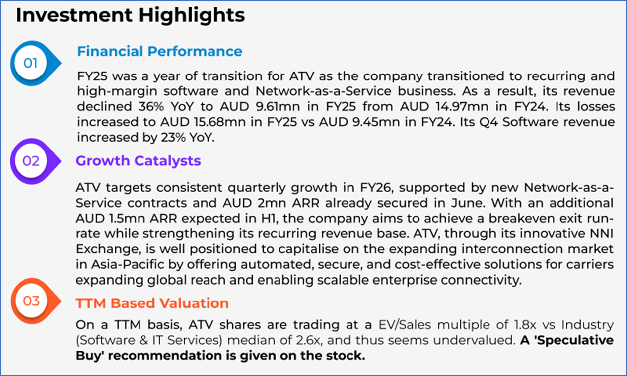 Company Overview: Activeport Group Limited (ASX: ATV) is engaged in delivering network automation software solutions, tailored to the global telecommunications and information technology sectors. The Company’s advanced software solutions reduce complexity, lower costs, and enhance network performance. Kalkine’s Penny Stocks Report covers the Investment Highlights, Management Insights, Key Financial Metrics, Risks, and Technical Analysis along with support and resistance and TTM-based Valuation, Target Price, and Recommendation on the stock.