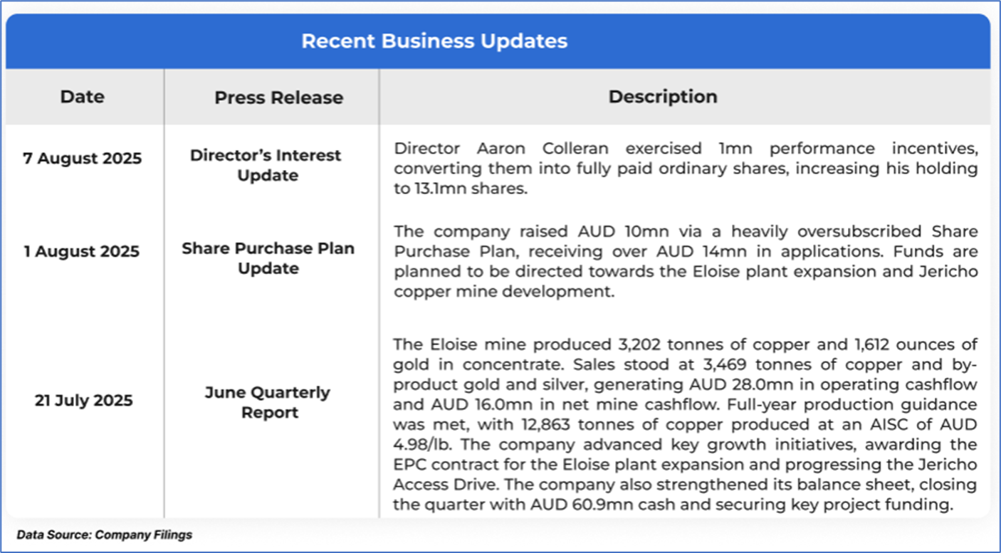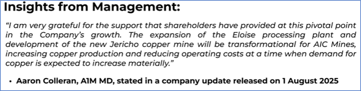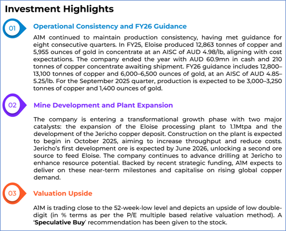 1.1: Company Overview: AIC Mines Limited (ASX: A1M) is a growth-focused Australian resources company dedicated to building a diverse portfolio of copper and gold assets through exploration, development, and acquisition. The company operates the high-grade Eloise copper mine in North Queensland. It has been advancing a range of exploration projects with potential for copper and gold. Kalkine’s Gold Report covers the Investment Highlights, Management Insights, Key Financial Metrics, Risks, Technical Analysis along with the Valuation, Target Price, and Recommendation on the stock.