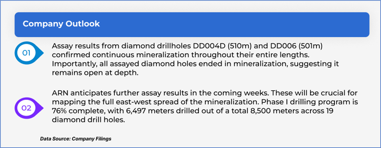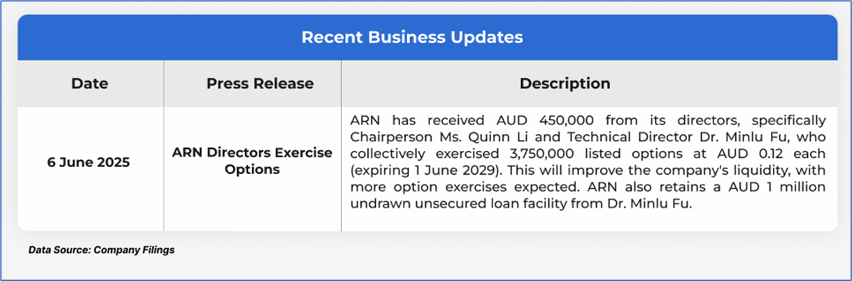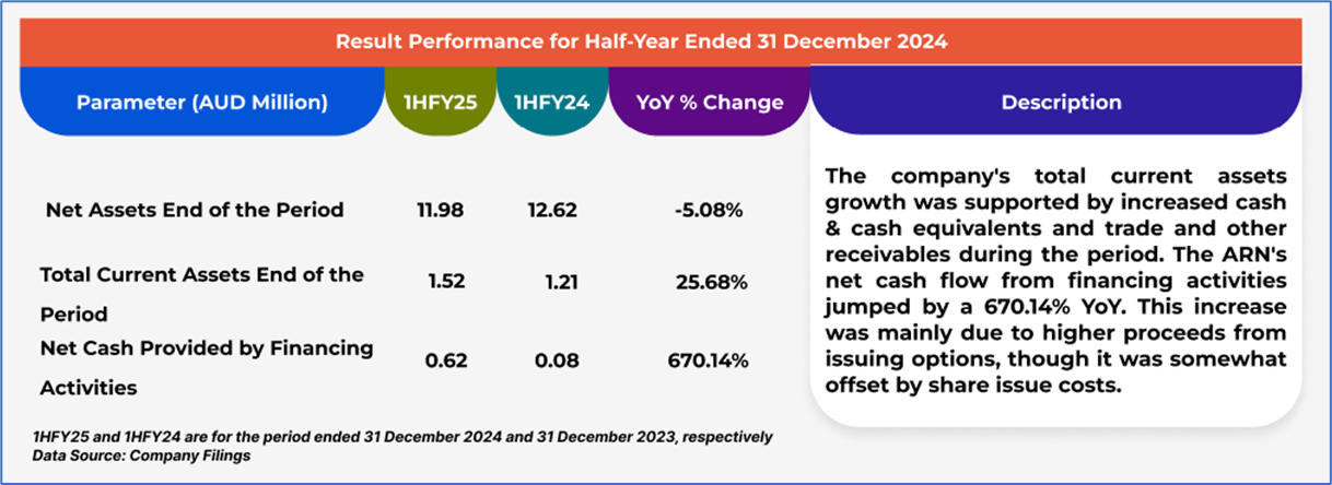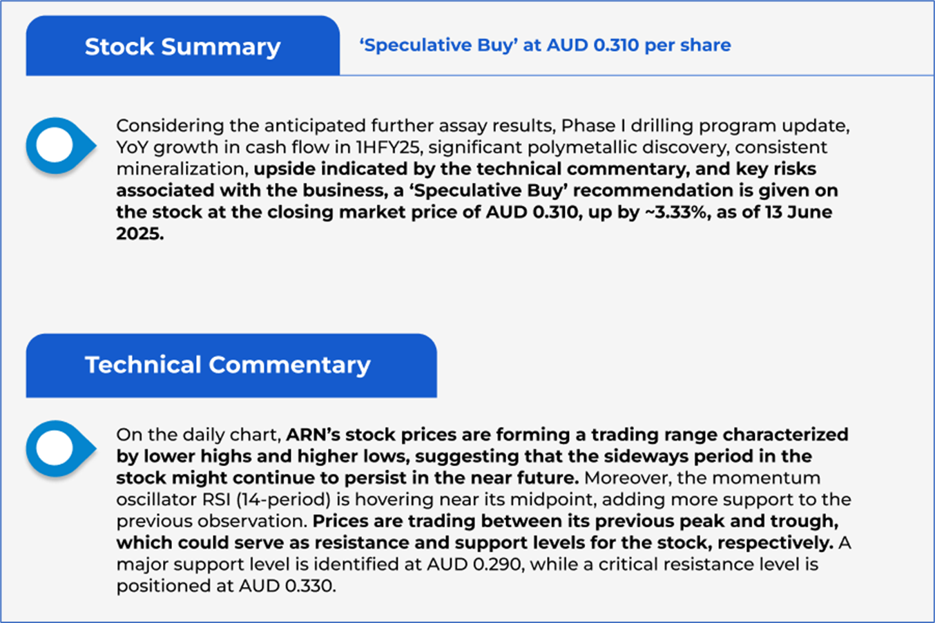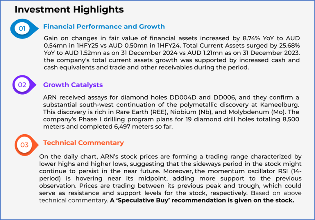 The stock went down by ~3.12% in the last one month, and over the past six months, stock has increased by ~5.08%. The stock has a 52-week low and 52-week high of AUD 0.064 and AUD 0.710, respectively, and is currently below the 52-week high-low average. ARN was last covered in a report dated ‘09 May 2025’.