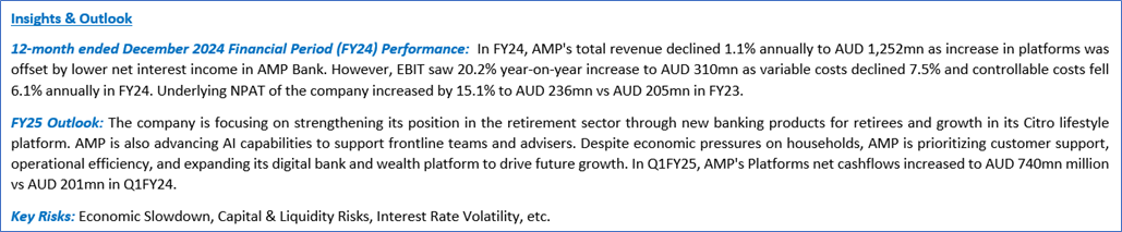 The stock has witnessed a correction of ~7.99% in last three months, and over the past six months, it has decreased by ~18.65%. The stock has a 52-week low and 52-week high of AUD 1.040 and AUD 1.790, respectively and is currently trading below the 52-week high-low average. AMP was last covered in a report dated ‘20 February 2025’.
