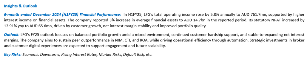 The stock has corrected by ~17.68% in the last three months, and over the past six months, it has declined by ~3.11%. The stock has a 52-week low and 52-week high of AUD 2.920 and AUD 4.250, respectively and is currently trading below the 52-week high-low average. LFG was last covered in a report dated ‘31 January 2025’.