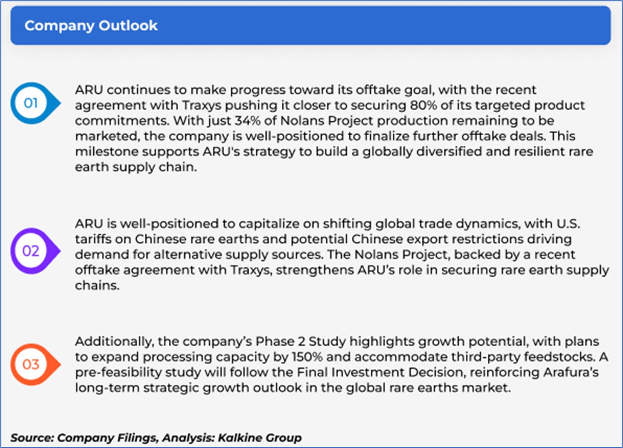 1.1: Company Overview: Arafura Rare Earths Limited (ASX: ARU) engages in the exploration and development of mineral properties in Australia, which focuses on the production of rare earth products, such as neodymium-praseodymium and mixed middle-heavy rare earth oxides. Kalkine’s Global Tariff Report covers the Investment Highlights, Management Insights, Key Financial Metrics, Risks, Technical Analysis along with the Valuation, Target Price, and Recommendation on the stock.