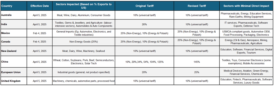 As illustrated in the table below, several key sectors in different countries are directly impacted by the recent tariff announcement from President Trump.