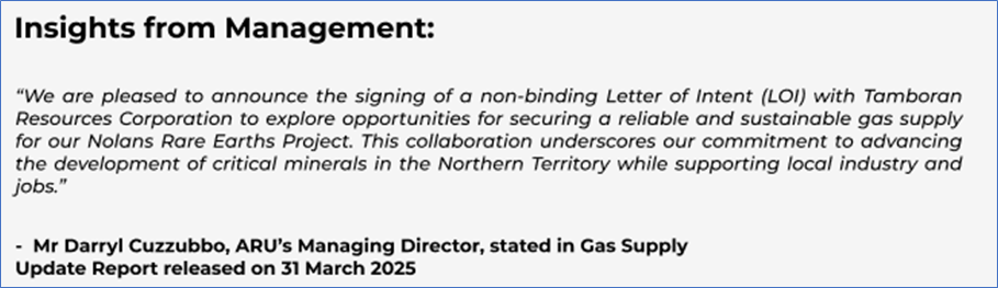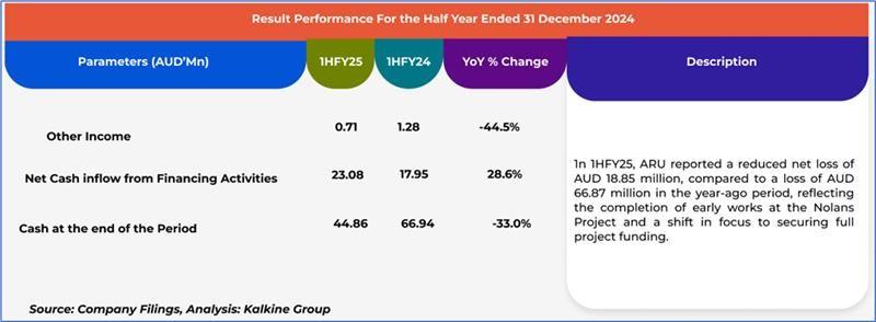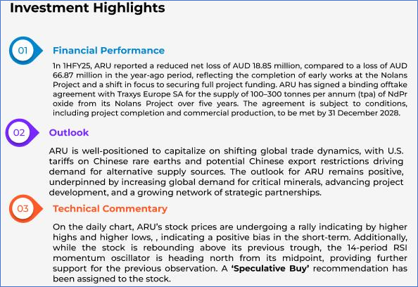 The stock price has gone up by ~4.54% in the last one month and over the last six months, stock prices went down by ~1.42%. The stock has a 52-week low and 52-week high of AUD 0.105 and AUD 0.210, respectively, and is currently trading above the mid-range of the 52-week-high-low levels. ARU was last covered in a report dated ’14 March 2025’.