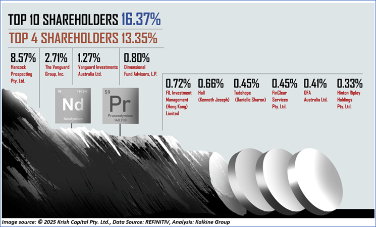1.3: Top 10 Shareholders: The top 10 shareholders together form ~16.37% of the total shareholding. Hancock Prospecting Pty. Ltd. and The Vanguard Group, Inc. are holding maximum stakes in the company at ~8.57% and ~2.71%, respectively.