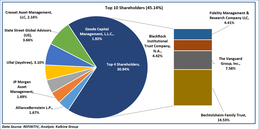 1.3 Top 10 Shareholders: The top 10 shareholders have been highlighted in the chart below, which together form ~45.14% of the total shareholding.