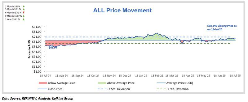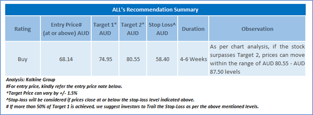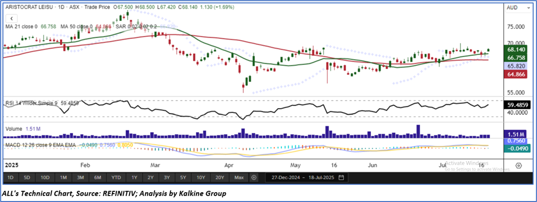 As per the above-mentioned price action and technical indicators analysis, a ‘Buy’ rating has been given on Aristocrat Leisure Ltd (ASX: ALL) at closing price of AUD 68.14 as on July 18, 2025.