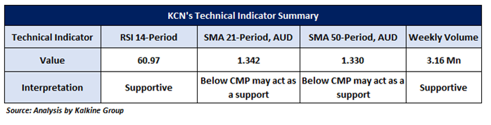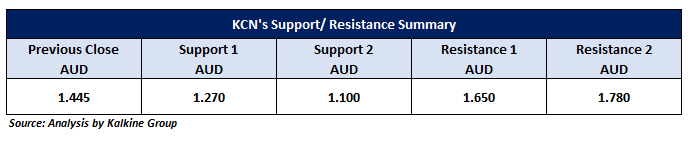 On the daily chart, KCN prices are holding above the downward-sloping trendline support, signalling potential upside momentum. The stock has consistently maintained this level, reinforcing the possibility of continued strength. Currently, KCN is approaching its next resistance at AUD 1.65, a key level it may test in the short term (2-4 weeks). A decisive breakout above AUD 1.65, especially with strong trading volumes, could attract further buying interest, potentially driving prices toward the next target at AUD 1.78.