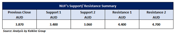 On the daily chart, NUF prices are holding support above the falling trendline breakout level, signalling potential upward momentum. Since the breakout, the stock has consistently maintained this support zone, strengthening the case for further gains. Currently, NUF is approaching its next resistance level at AUD 4.40, a key hurdle in the short term (2-4 weeks). A successful breakout above this level, especially with strong trading volumes, could attract additional buying interest, potentially driving prices toward the next target at AUD 4.70.