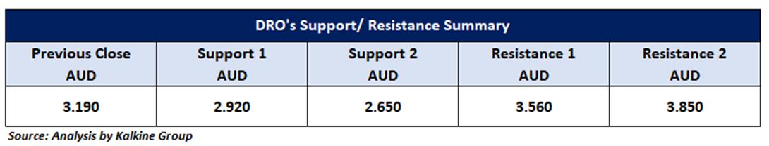 On the daily chart, DRO is trading above a key horizontal trendline support, reinforcing the case for sustained bullish momentum. This support zone has been pivotal in maintaining positive sentiment and the stock’s upward trajectory. In the near term (2–4 weeks), the stock is approaching a critical resistance level at AUD 3.56. A decisive breakout above this level, particularly if confirmed by rising volumes, could spark renewed buying interest and open the path toward the next upside target near AUD 3.85.