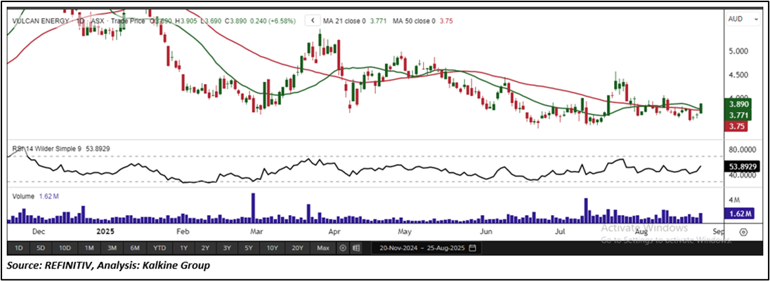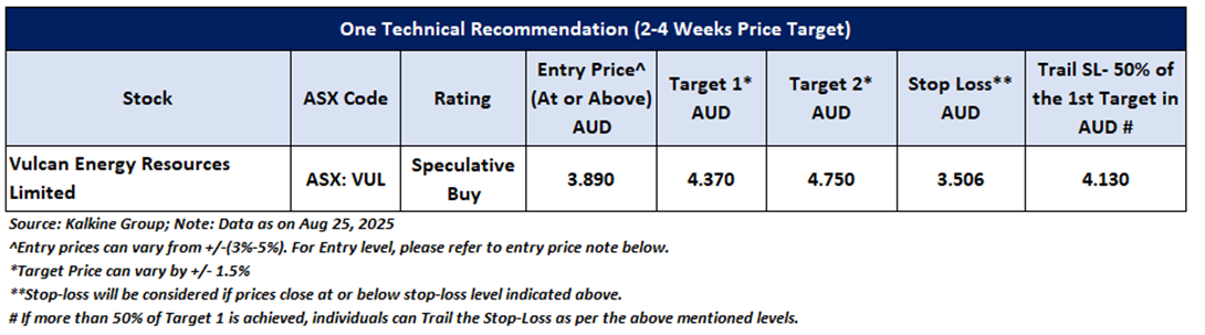 As per the above-mentioned price action and technical indicators analysis, Vulcan Energy Resources Limited is looking technically well-placed on the chart, and a ‘Speculative Buy’ recommendation has been given on the stock. Investment decision should be made depending on an individual’s appetite for an upside potential, risks, and any previous holdings. This recommendation is purely based on technical indicator analysis, and fundamental analysis has not been considered in this report. Vulcan Energy Resources Limited (ASX: VUL) was last covered in a report dated '21 July 2025'. Summary of recommendation is as follows: