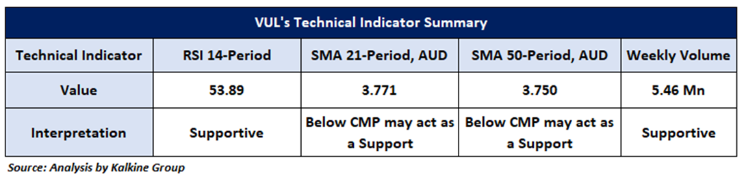 On the daily chart, VUL is holding above a key horizontal trendline support, reinforcing the potential for continued bullish momentum. This support zone has been instrumental in sustaining positive sentiment and the stock’s upward trajectory. In the short-term outlook (2–4 weeks), the stock is approaching a critical resistance level at AUD 4.37. A decisive breakout above this level, especially if supported by increased trading volume could spark renewed buying interest and open the path toward the next target near AUD 4.75.