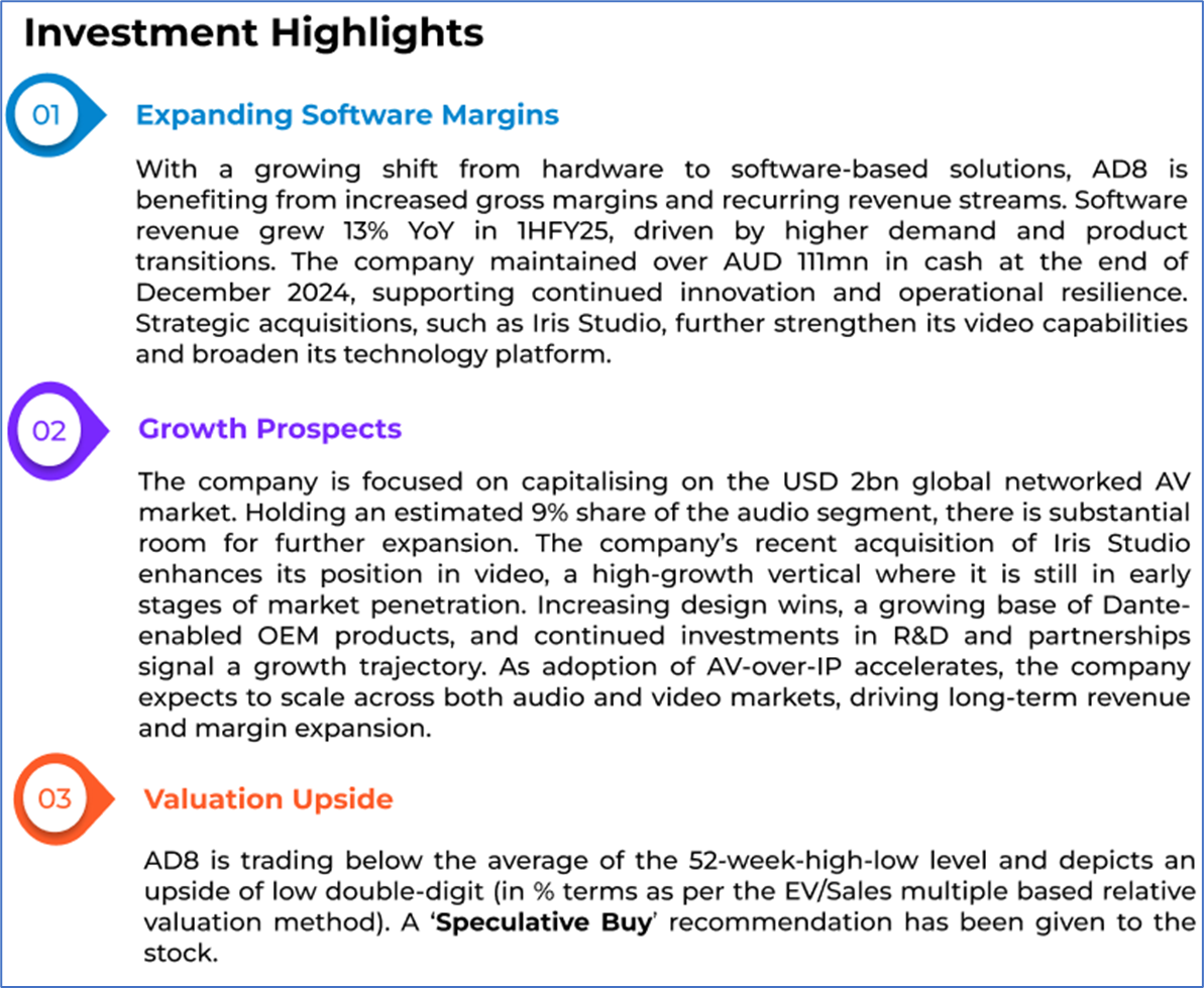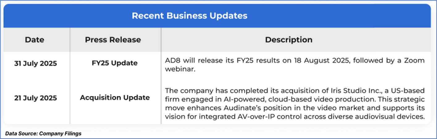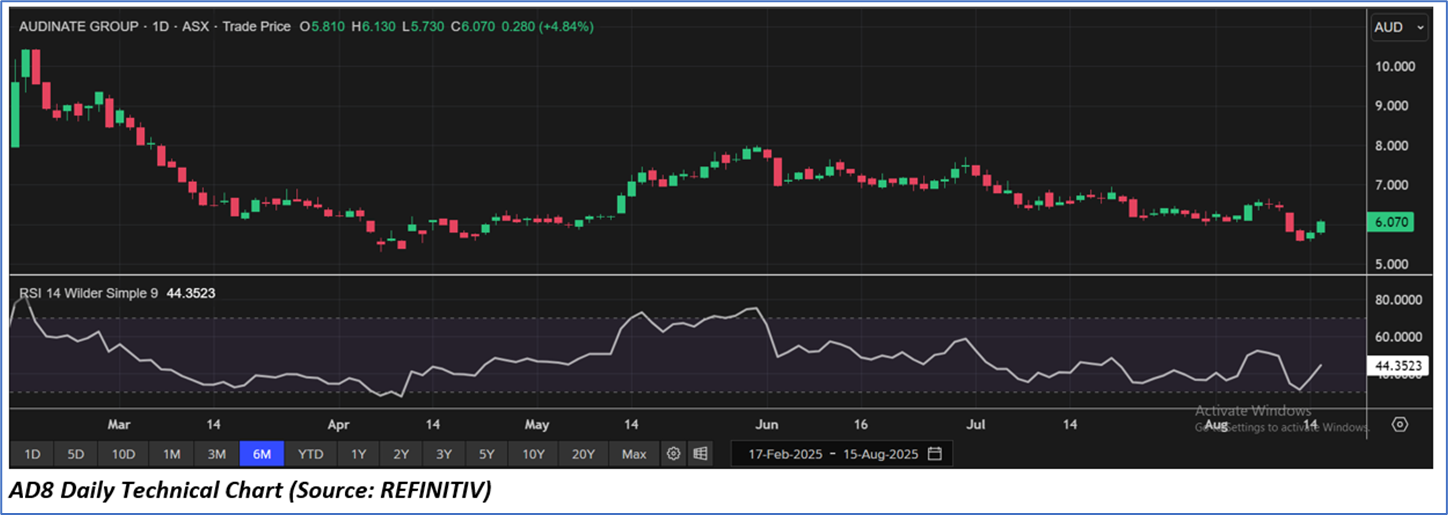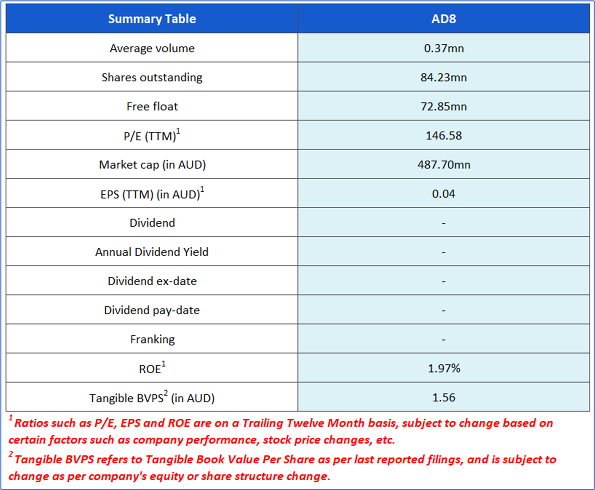 The stock price has gone down by ~9.81% in the last one month and over the last six months, stock prices declined by ~36.70%. The stock has a 52-week low and 52-week high of AUD 5.300 and AUD 11.540, respectively, and is currently trading below the average of the 52-week-high-low level. AD8 was last covered in a report dated ‘8 July 2025’.