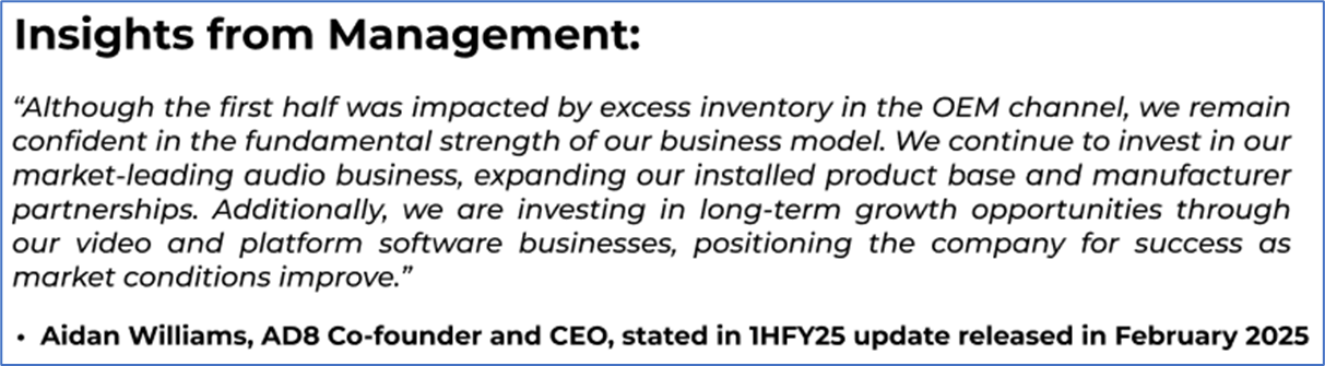 1.1: Company Overview: Audinate Group Limited (ASX: AD8) is a provider of professional audio-video (AV) networking technologies globally. The developer of the Dante® media networking solution is headquartered in Australia and has regional offices in the US, Belgium, Hong Kong, and the UK. Its Dante IP networking solution is used extensively in the professional live sound, commercial installation, broadcast, public address, and recording industries. Kalkine’s Technology Report covers the Investment Highlights, Management Insights, Key Financial Metrics, Risks, Technical Analysis along with the Valuation, Target Price, and Recommendation on the stock.