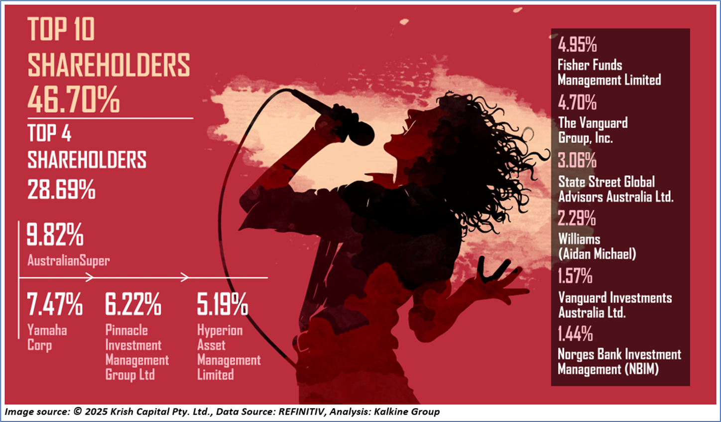 1.3: Top 10 Shareholders: The top 10 shareholders together form ~46.70% of the total shareholding. AustralianSuper and Yamaha Corp are holding maximum stakes in the company at ~9.82% and ~ 7.47%, respectively.