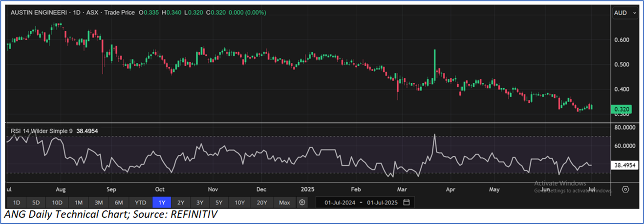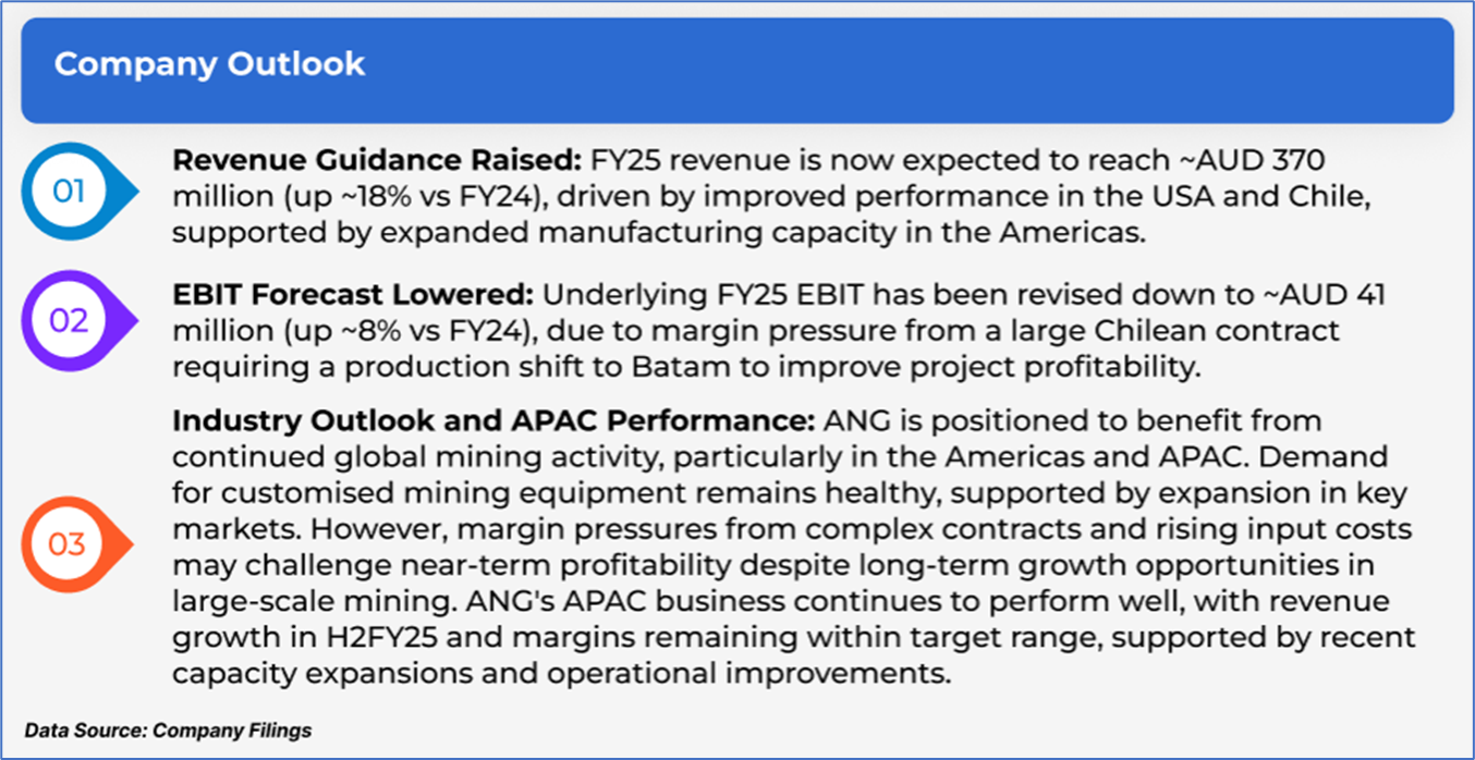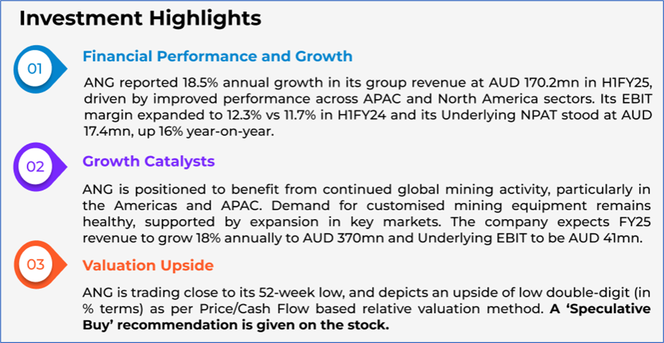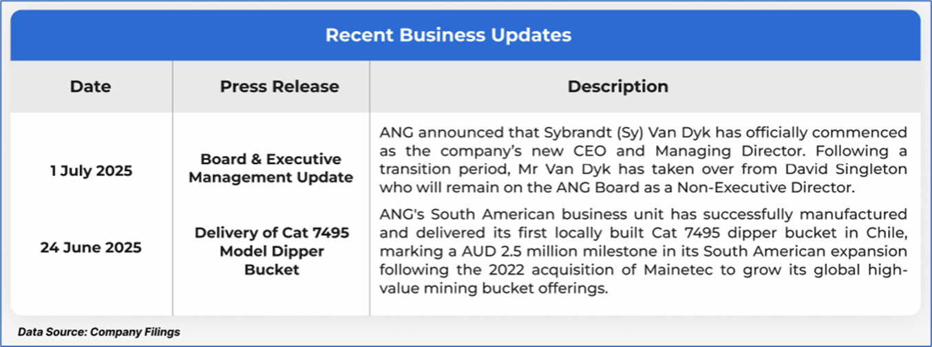 The stock has declined by ~24.21% in the last three months, whereas over the last six months, the stock has corrected by ~35.83%. The stock has a 52-week low and 52-week high of AUD 0.305 and AUD 0.670, respectively, and is currently trading close to its 52-week low. ANG was last covered in a report dated ‘13 June 2025’.