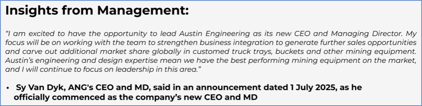 Company Overview: Austin Engineering Limited (ASX: ANG) is an Australia-based global engineering company. ANG is engaged in designing and manufacturing of loading and hauling solutions, including off-highway dump truck bodies, buckets, water tanks and related attachments, supporting both open-cut and underground operations. Complementing its proprietary product range are repair and maintenance services performed in its workshops and on clients' mine sites, and spare parts. Kalkine’s Growth Report covers the Investment Highlights, Management Insights, Key Financial Metrics, Risks, Technical Analysis along with the Valuation, Target Price, and Recommendation on the stock.