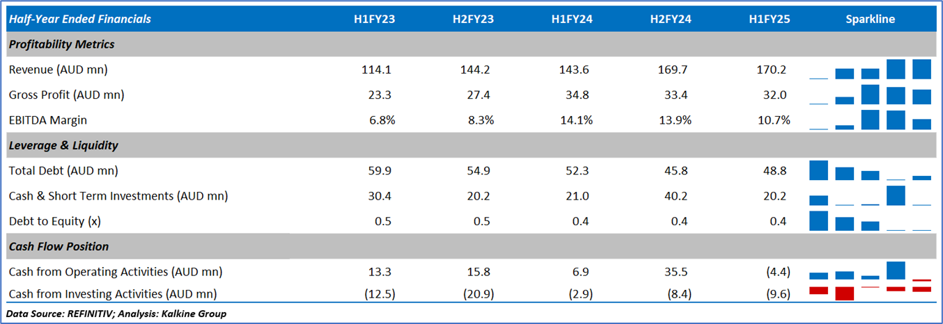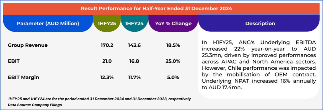 1.4 Key Metrics: In H1FY25, ANG's EBITDA margin stood at 10.7% in H1FY25 vs industry median of 8.5%. Below is captured other metrics: