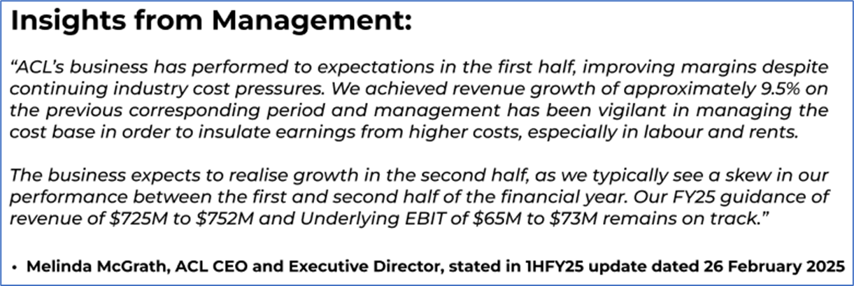 1.4: Key Metrics: ACL paid an interim fully franked dividend of 3.5 cents per share for 1HFY25, representing 59% of underlying NPAT attributable to members. This aligned with the company’s target payout range of 50–70% of full-year NPAT. The record date was 28 March 2025, with the payment made on 16 April 2025. In 1HFY24, the company paid an interim dividend of 3.0 cents per share. Below is captured the metrics showing the trend of revenue and operating income since 1HFY23: