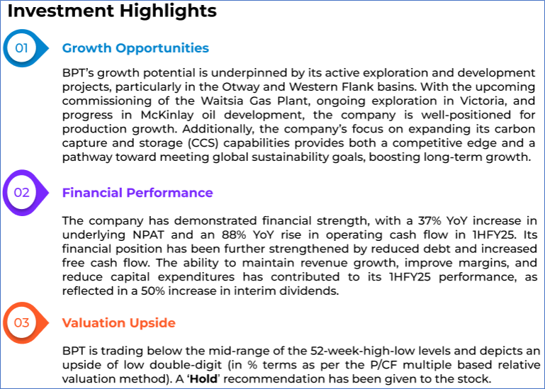 The stock price has gone up by ~1.06% in the last one month and over the last 6 months, stock prices increased by ~23.71%. The stock has a 52-week low and 52-week high of AUD 1.065 and AUD 1.925, respectively, and is currently trading below the mid-range of the 52-week-high-low levels. BPT was last covered in a report dated ‘13 February 2025’.