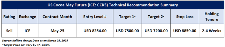 Having understood the global commodities performance over the past week, taking cues from major global economic events, and based on technical analysis, noted below is the recommendation with the generic insights, entry price, target prices, and stop-loss US Cocoa May Future (ICE: CCK5) for the next 2-4 weeks duration: