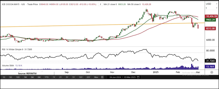 Price Action and Technical Indicator Analysis: Cocoa futures for May are trading below a descending trendline and a bearish candlestick pattern, indicating potential for further downside. The price opened lower, falling below the support level and trading beneath the 21-period Simple Moving Average (SMA), reinforcing the bearish outlook. On the daily charts, a strong resistance level adds to the negative outlook. The Relative Strength Index (RSI) stands at 31.72, indicating bearish momentum, while the 50-period SMA offers short-term resistance. These technical indicators suggest a bearish market trend for cocoa in the near term.