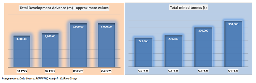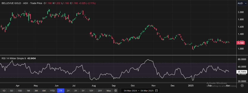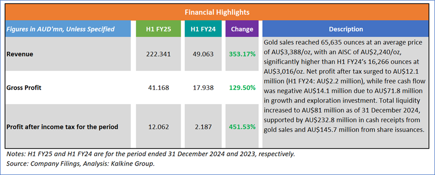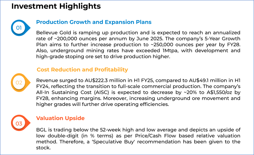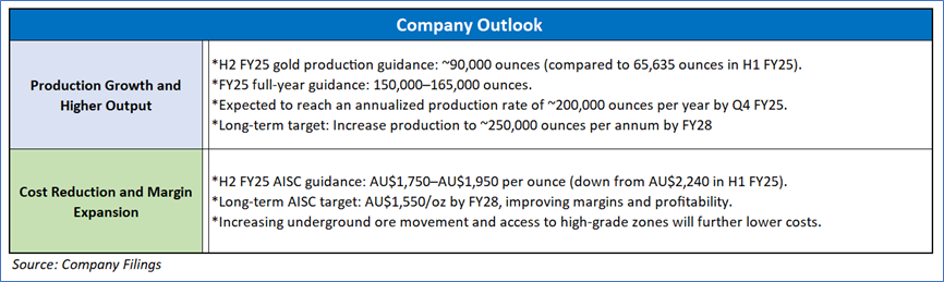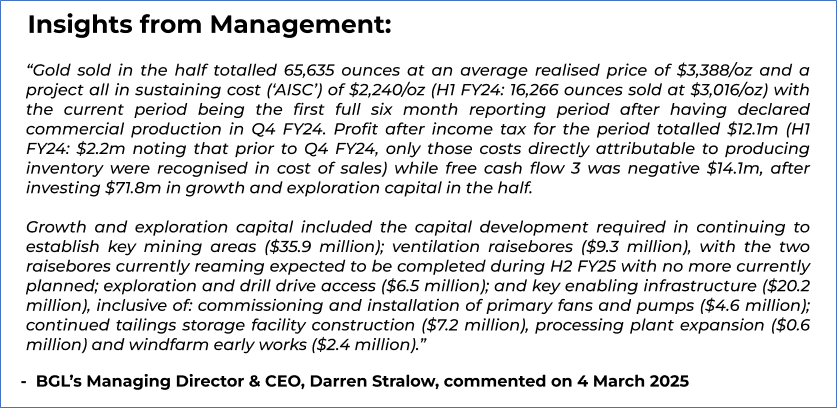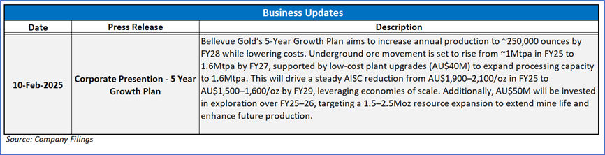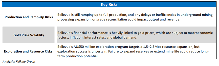 1.4 Key Metrics: Bellevue Gold plans to ramp up production in H2 FY25, supported by infrastructure upgrades and an expanded mining fleet. The company has achieved a >1Mtpa mining rate as of December 2024, with seven independent mining fronts and six operational jumbos driving increased development. Processing remains strong at 1.0-1.2Mtpa, with a 1.35Mtpa throughput successfully tested and 94% recovery rates in Q4 2024. H2 FY25 production is forecast at ~90,000 ounces at a lower AISC of AU$1,750–1,950/oz (ounce), compared to 65,635 ounces at AU$2,240/oz in H1 FY25. With a planned AU$155M investment in growth and exploration, Bellevue is on track with higher output and improved cost efficiency. Below are captured some key metrics: