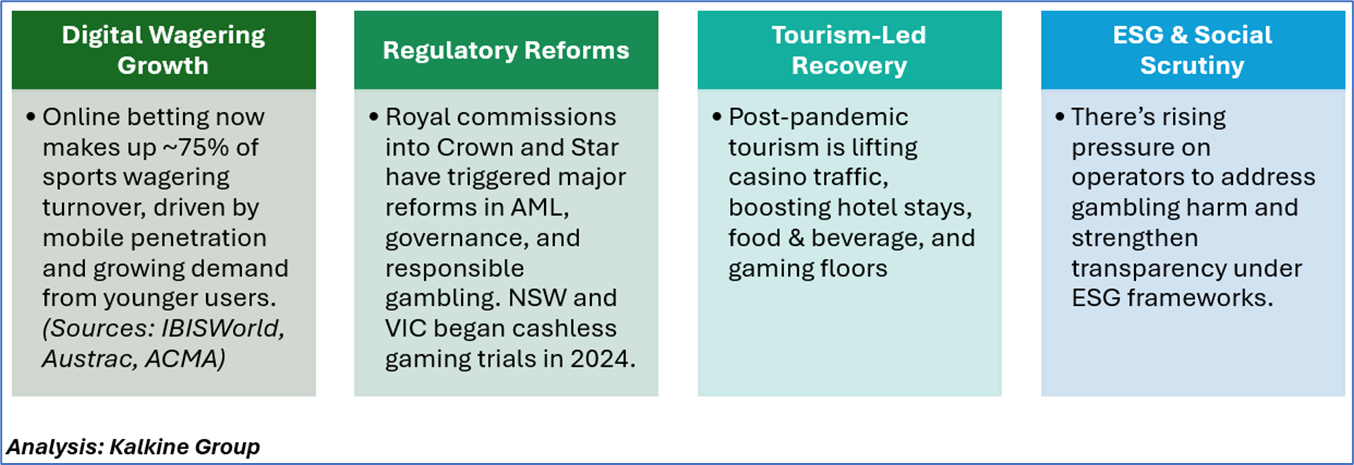 The Australian Casinos & Gaming industry is entering a stabilization phase recovering from reputational damage while embracing digital expansion. Growth will likely be driven by: