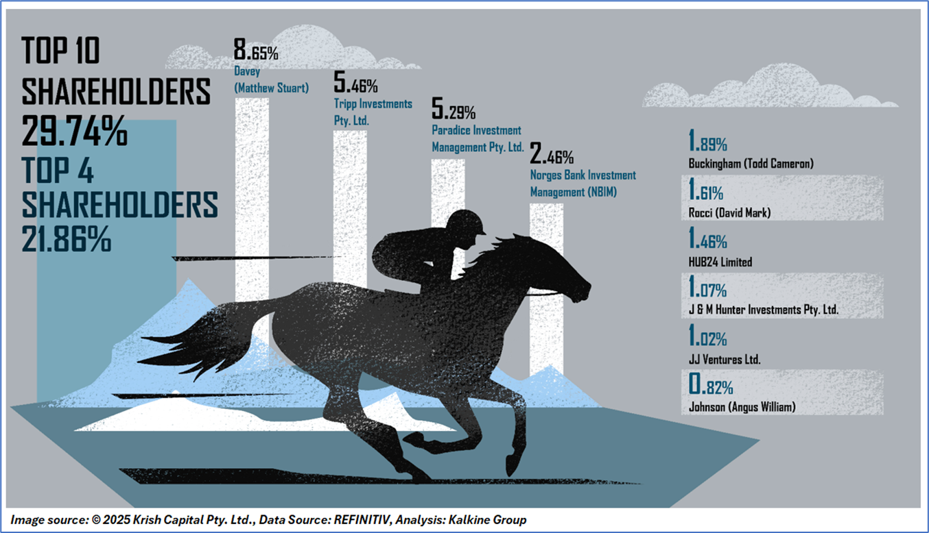 The top 10 shareholders together form ~29.74% of the total shareholding. Davey (Matthew Stuart), Tripp Investments Pty. Ltd. hold maximum stakes of 8.65% and 5.46%, respectively.