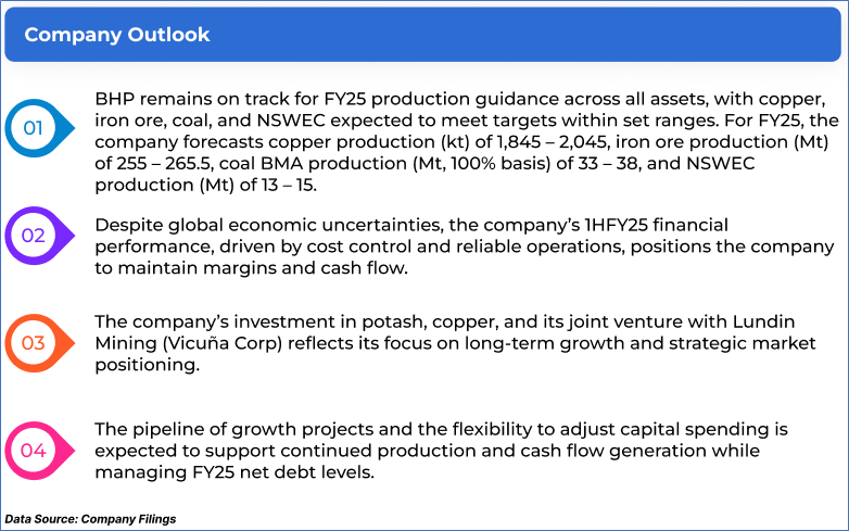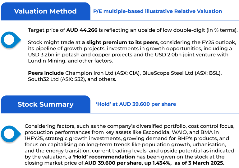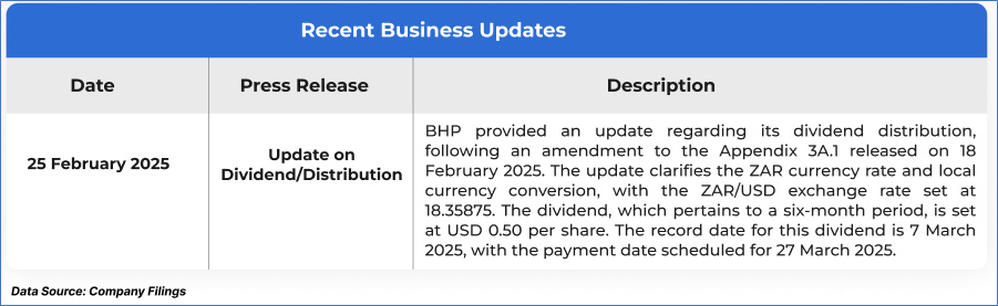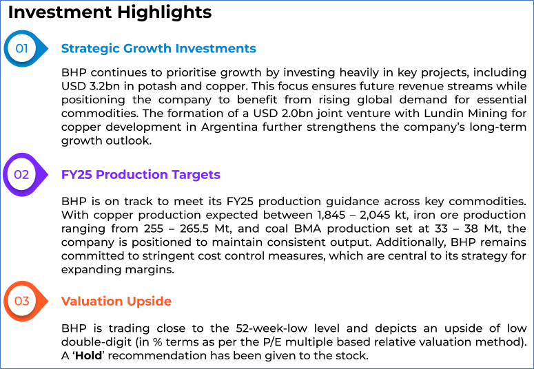 1.1: Company Overview: BHP Group Limited (ASX: BHP) is a global leader in the resources sector, primarily engaged in the exploration, production, and processing of a diverse range of minerals, including iron ore, copper, and coal. With operations spanning across multiple continents, BHP is committed to delivering sustainable value through innovation, responsible resource management, and long-term growth strategies. Kalkine’s Investor Report covers the Investment Highlights, Management Insights, Key Financial Metrics, Risks, Technical Analysis along with the Valuation, Target Price, and Recommendation on the stock.