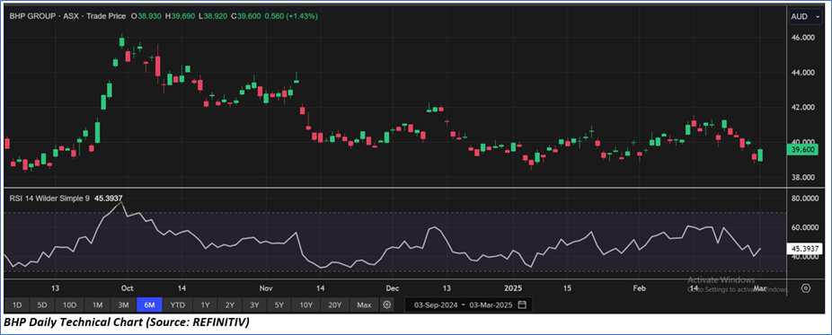 The stock price has gone up by ~0.92% in the last one month and over the last 6 months, stock prices declined by ~0.08%. The stock has a 52-week low and 52-week high of AUD 38.280 and AUD 46.410, respectively, and is currently trading close to the 52-week-low level. BHP was last covered in a report dated ‘3 February 2025’.