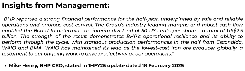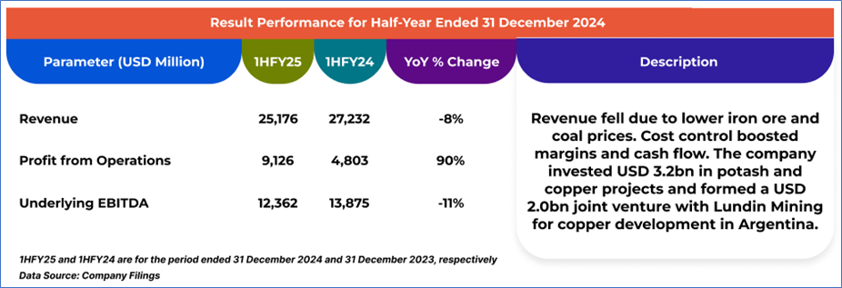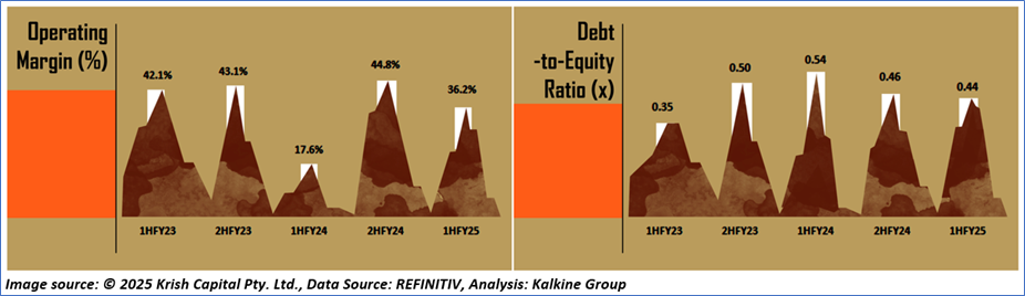 1.4: Key Metrics: BHP registered a profit from operations of USD 9,126mn in 1HFY25, up 90% year-on-year from USD 4,803mn in 1HFY24. Below is captured the metrics showing the trend of operating margin and debt-to-equity ratio since 1HFY23: