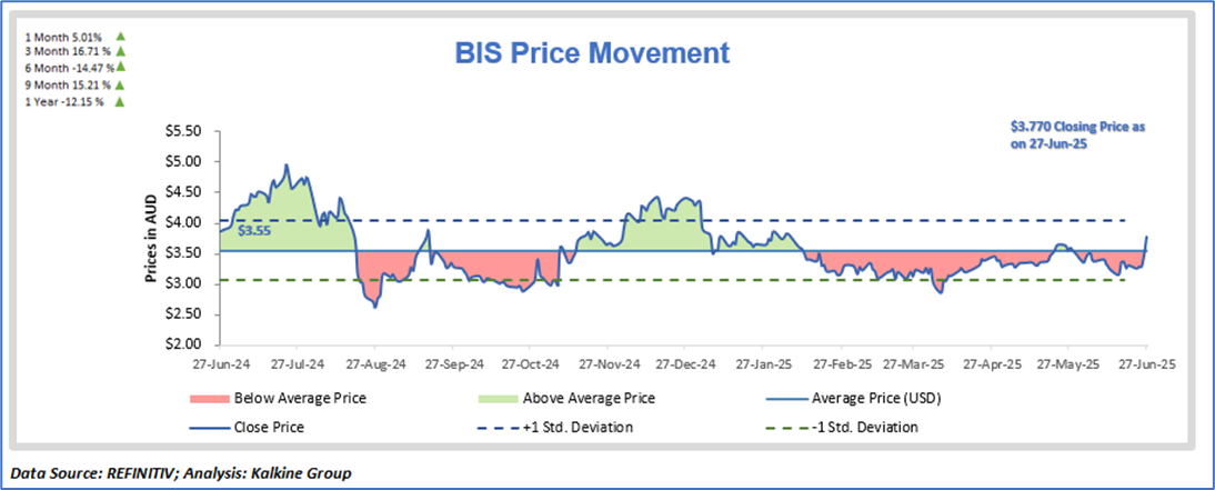 As per the above-mentioned price action and technical indicators analysis, a ‘Speculative Buy’ rating has been given on Bisalloy Steel Group Limited (ASX: BIS) at closing price of AUD 3.77 as on June 27, 2025.