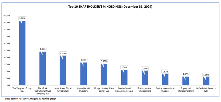 The top 10 shareholders together form ~33.05% of the total shareholding, signifying concentrated shareholding. The Vanguard Group, Inc. and BlackRock Institutional Trust Company, N.A. are the biggest shareholders, holding the maximum stake in the company at 9.28% and 4.85%, respectively.