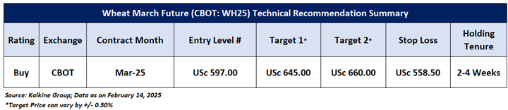 Having understood the global commodities performance over the past week, taking cues from major global economic events, and based on technical analysis, noted below is the recommendation with the generic insights, entry price, target prices, and stop-loss Wheat March Future (CBOT: WH25) for the next 2-4 weeks duration: