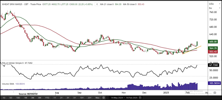 Price Action and Technical Indicator Analysis: March wheat futures are trading above key horizontal and ascending trendline support levels, having formed a candlestick pattern that signals increasing momentum, suggesting potential for further bullish movement. The rising trading volume supports the strength of the uptrend, indicating that the rally could continue to pick up steam after recent gains. On the daily chart, a strong support level further emphasizes the bullish momentum. The Relative Strength Index (RSI) at 67.72 shows more potential, with continued bullish momentum likely. Meanwhile, the 50-period simple moving average (SMA) provides support. These technical indicators suggest a loss of upward momentum for coffee, with the market potentially entering a consolidation phase.