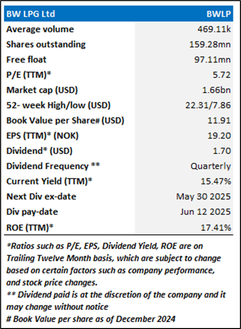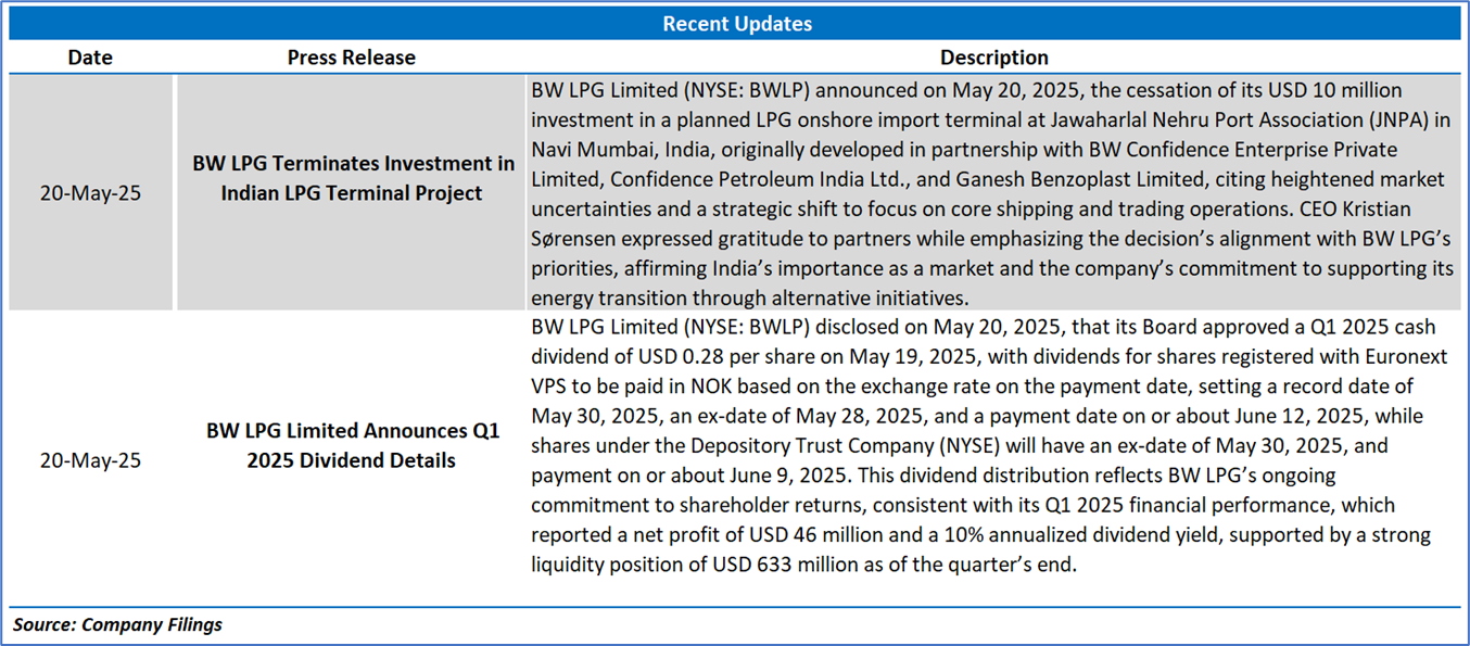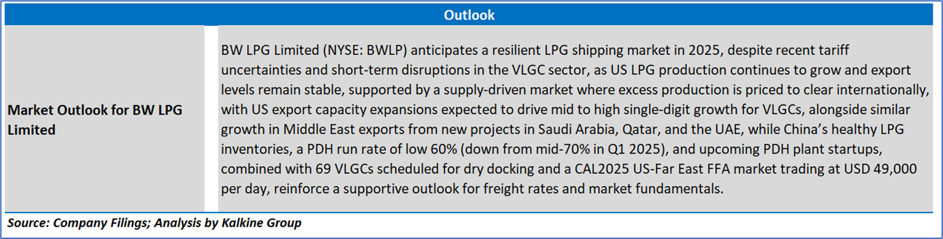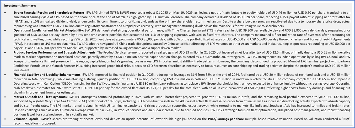 BW LPG Limited (NYSE: BWLP) announced a Q1 2025 cash dividend of USD 0.28 per share, approved by the Board, as reported on May 19, 2025, reaffirming its dedication to delivering consistent shareholder value. The dividend, representing a 75% payout ratio of Shipping Net Profit After Tax (NPAT), will be distributed to shareholders with a record date aligned with standard market practices, and payment expected shortly after the announcement, consistent with prior distribution timelines such as the Q4 2024 schedule, which had payments around late March 2025. This quarterly dividend translates to an annualized dividend yield of 10%, based on the share price at the end of March 2025 or 15.47% as of May 27th 2025, making BWLP an attractive option for income-focused investors. The Company’s financial strength, underpinned by a Q1 2025 NPAT of USD 46 million, operational cash flow supporting a liquidity position of USD 633 million, and strategic fleet optimization with 79% of Q2 2025 fleet days fixed at USD 35,000 per day, ensures the sustainability of this dividend despite a slight reduction in net leverage to 31%. With no reinvestment option, this mandatory distribution, alongside BWLP’s robust performance in the Very Large Gas Carrier (VLGC) market and a projected 2025 shipping profitability of USD 161 million from its time charter and fixed portfolio, positions the company as a compelling choice for dividend investors seeking both yield and growth in a dynamic LPG market.