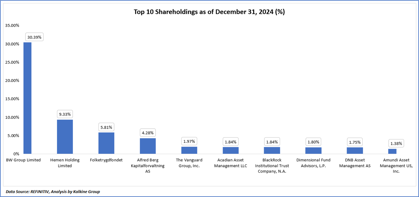 The top 10 shareholders together form ~60.39% of the total shareholding, signifying concentrated shareholding. BW Group Limited and Hemen Holding Limited are the biggest shareholders, holding the maximum stake in the company at ~30.39% and ~9.33%, respectively.