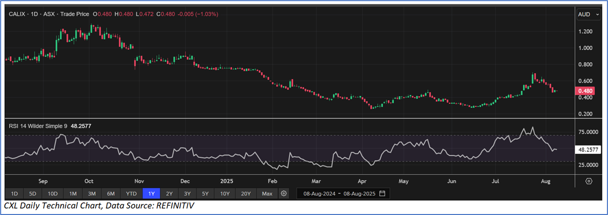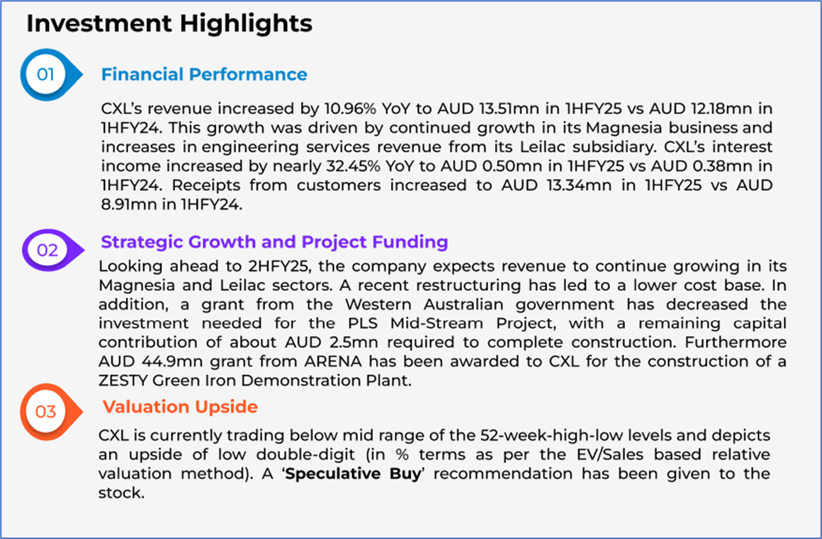 The stock has decreased by ~8.57% in the last six months, and over the past one year, the stock has gone down by ~43.53%. The stock has a 52-week low and 52-week high of AUD 0.260 and AUD 1.295, respectively, and is currently trading below the 52-week high-low average. CXL was last covered in a report dated ‘17 July 2025’.