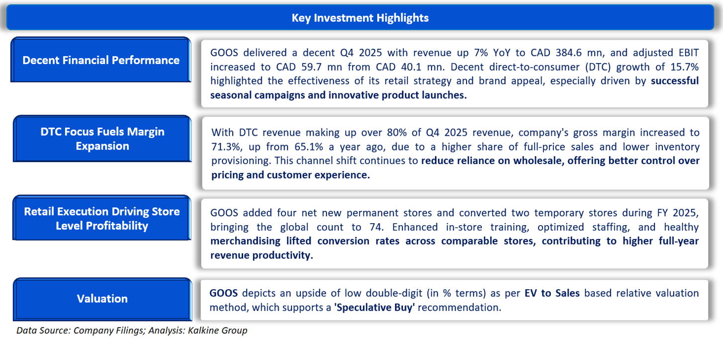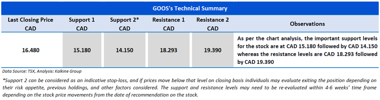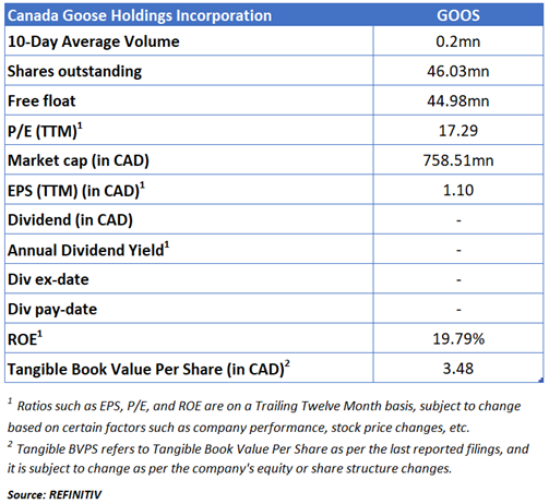 Canada Goose Holdings Incorporation (TSX: GOOS) is a Canada based company that designs, manufactures, distributes, and retails premium outerwear for men, women, and children. It operates business through three segments namely, Wholesale and Direct to Consumer (DTC), and Other. The DTC segment, which is the key revenue driver, comprises sales through country-specific e-commerce platforms and its company-owned retail stores located in luxury shopping locations. The Wholesale segment comprises sales made to a mix of functional and fashionable retailers, including major luxury department stores, outdoor specialty stores, and individual shops, and to international distributors. Geographically, it has a presence in Canada, the United States, Asia, Europe, and the Rest of the World.