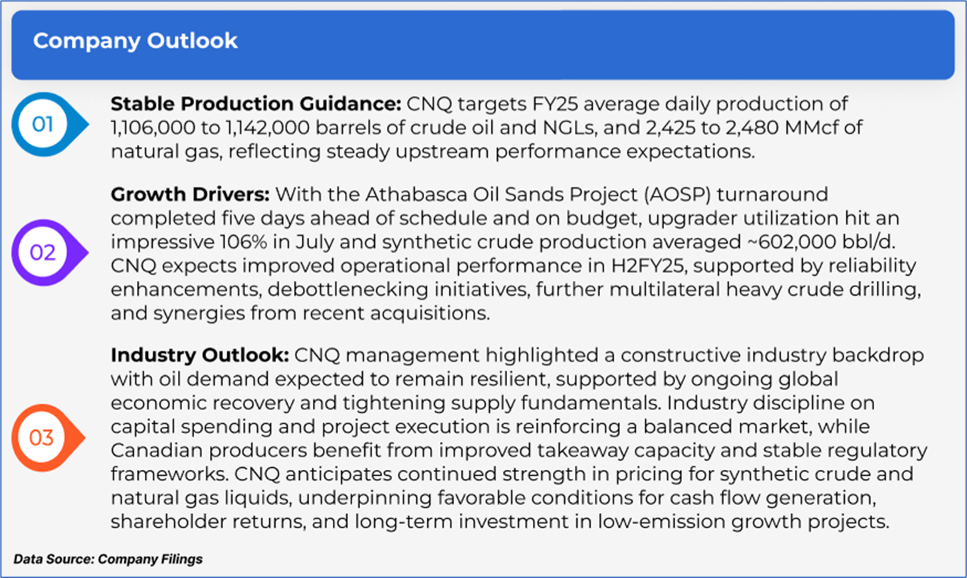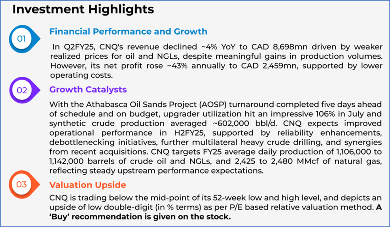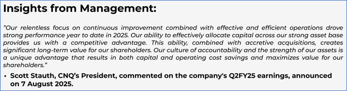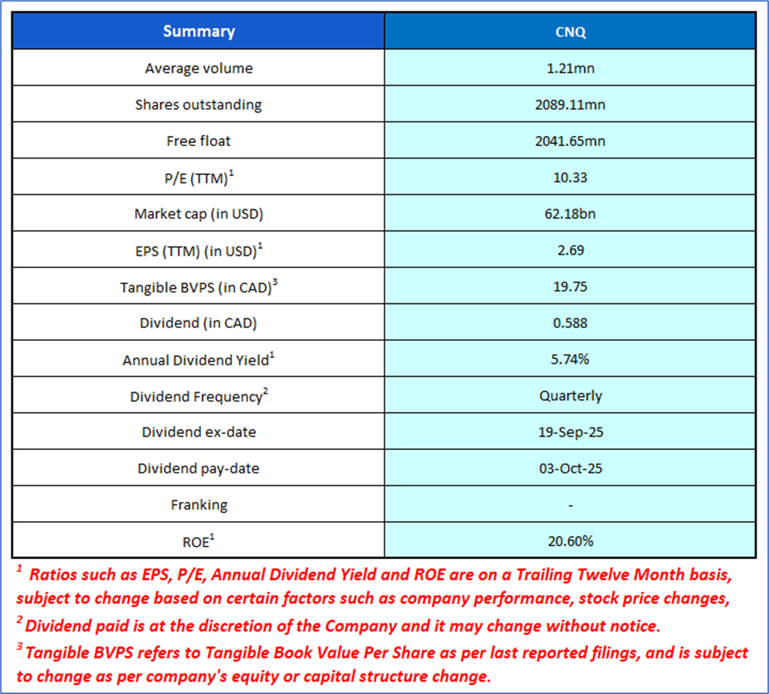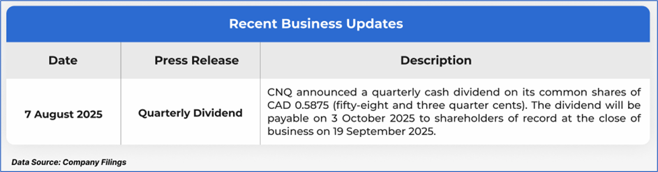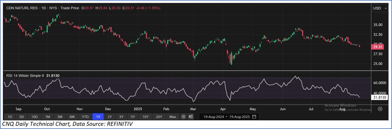 The stock has declined by ~12.95% in the last nine months, whereas over the last 12 months, it has decreased by ~19.94%. The stock has a 52-week low and 52-week high of USD 24.65 and USD 37.91, respectively, and is currently trading below the mid-point of its 52-week low and high. CNQ was last covered in a report dated ’14 May 2025’.