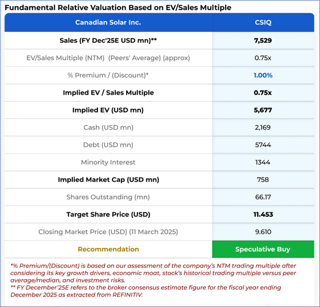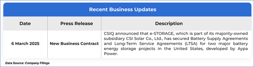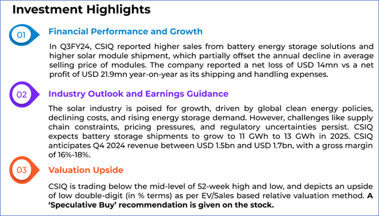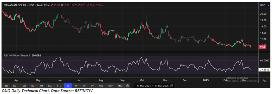 The stock has declined by ~24.03% in the last 3 months, whereas over the last 1 year, it has corrected by ~53.33%. The stock has a 52-week low and 52-week high of USD 9.29 and USD 21.05, respectively, and is currently trading below the average of 52-week high and low. CSIQ was last covered in a report dated ‘17 January 2025’.