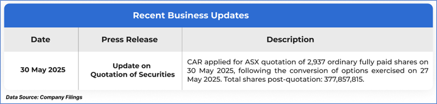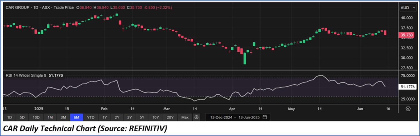 The stock price has gone down by ~1.46% in the last one month and over the last six months, stock prices declined by ~5.57%. The stock has a 52-week low and 52-week high of AUD 28.400 and AUD 42.705, respectively, and is currently trading slightly above the average of 52-week-high-low level. CAR was last covered in a report dated ‘14 March 2025’.