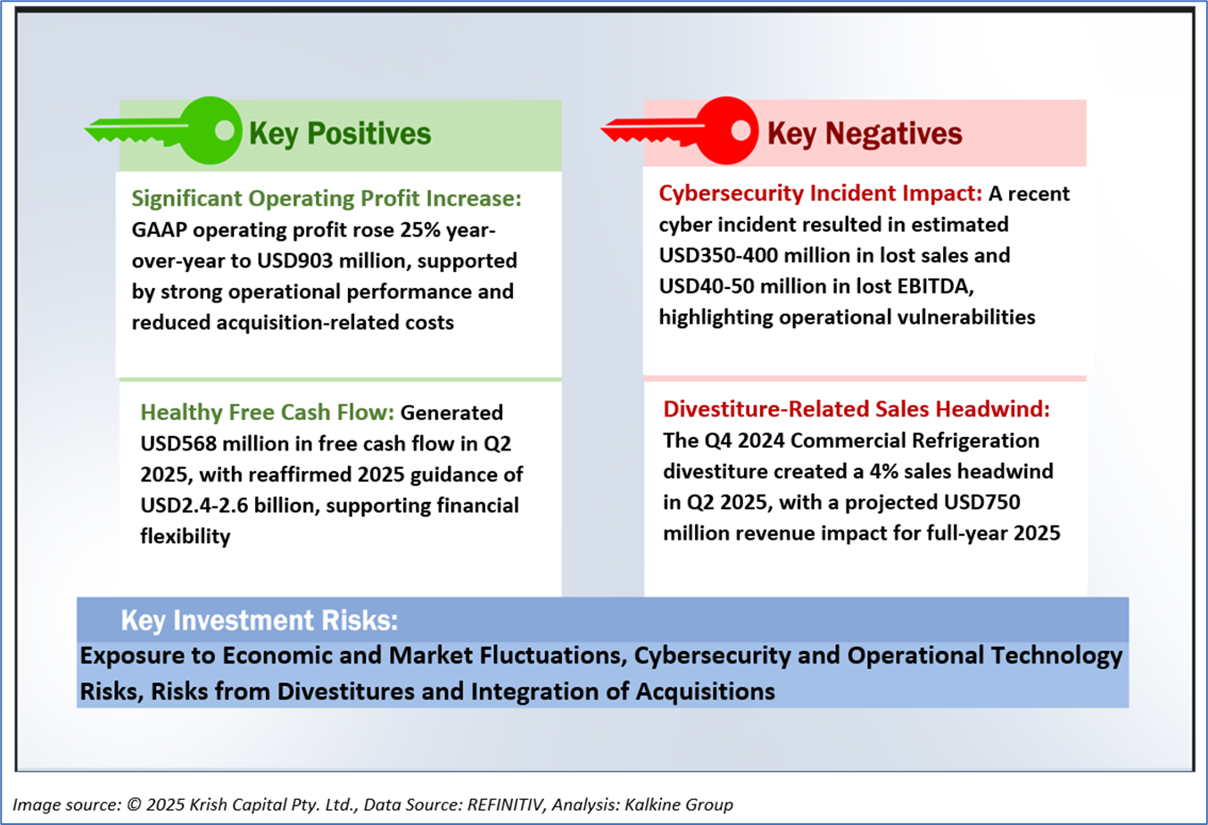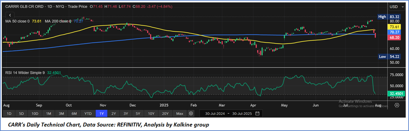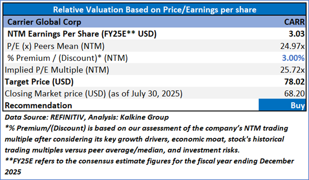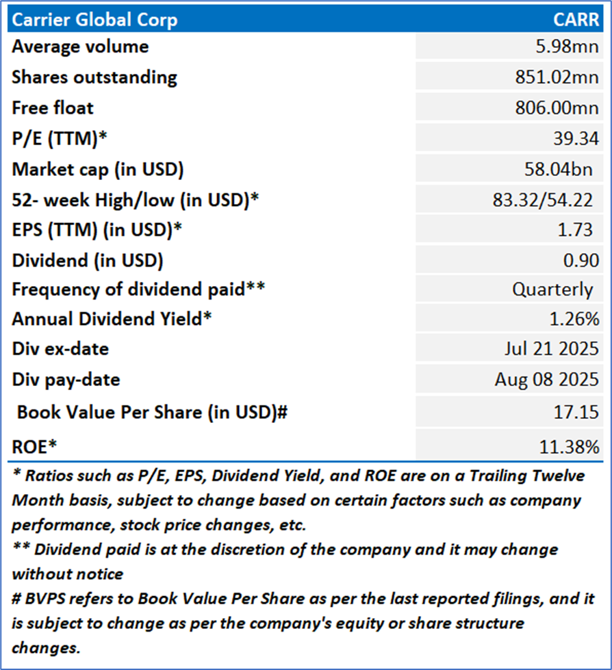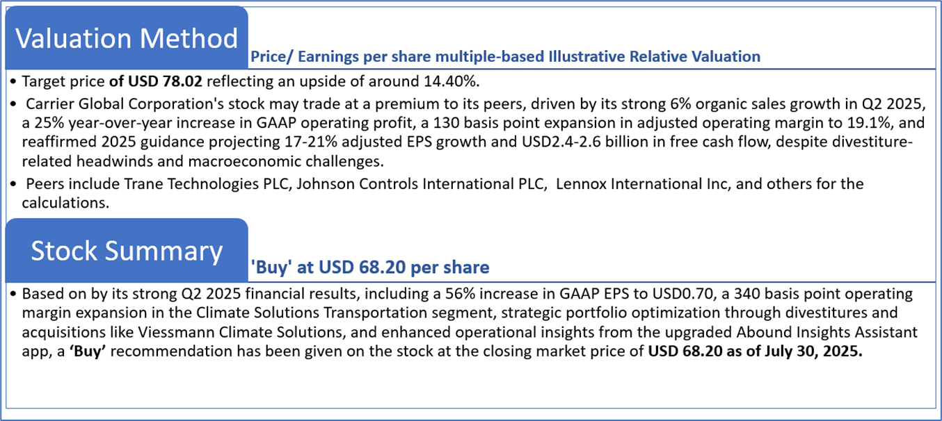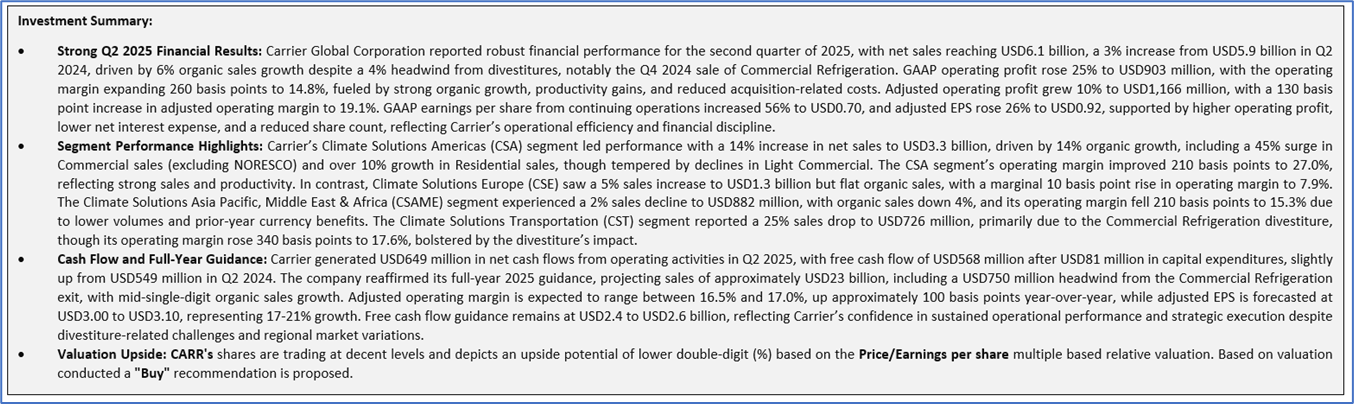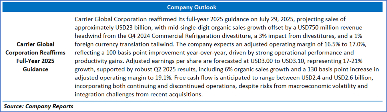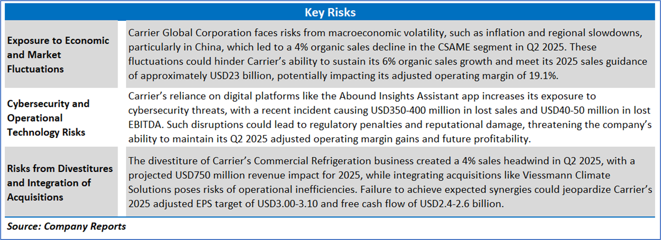 However, the free cash flow yield (TTM) declined to 1.81% from 3.47%, reflecting higher capital expenditures and divestiture impacts, and return metrics softened, with return on average common equity (TTM) dropping to 10.79% from 12.95%, return on average total assets (TTM) decreasing to 4.19% from 4.50%, and return on invested capital (TTM) falling to 15.67% from 16.80%, partly due to integration costs from the USD13 billion Viessmann acquisition and a recent cyber incident causing USD350-400 million in lost sales. Despite these challenges, Carrier’s reaffirmed 2025 guidance, projecting adjusted EPS of USD3.00-3.10 and free cash flow of USD2.4-2.6 billion, underscores its resilience and potential for sustained growth, though macroeconomic volatility and acquisition integration risks warrant close monitoring.