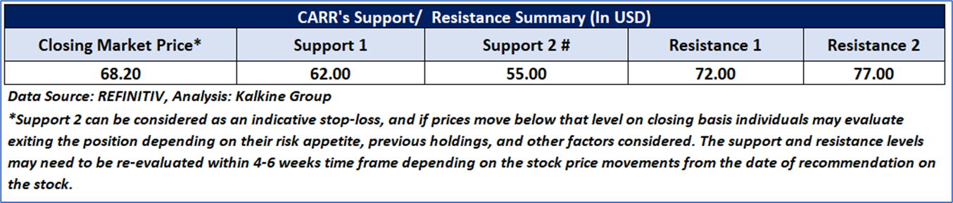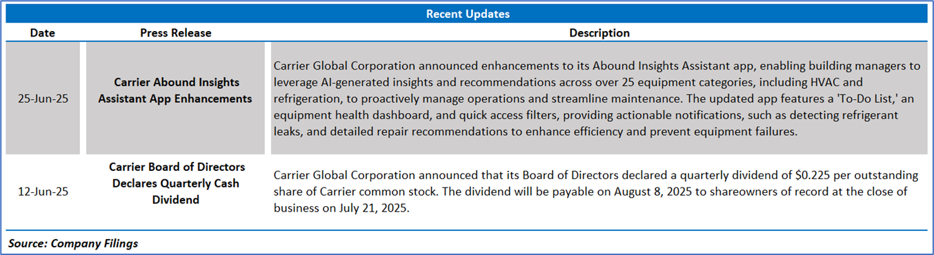 Carrier Global Corporation (NYSE: CARR) is engaged in providing intelligent climate and energy solutions with a focus on providing digitally enabled lifecycle solutions to its customers. The Company’s segment include Climate Solutions Americas, which provides products, controls, services and solutions to meet the heating, ventilation and cooling (HVAC) needs of residential and commercial customers in North and South America; Climate Solutions Europe segment provides products, controls, services and solutions to meet the HVAC needs of residential and commercial customers in Europe; Climate Solutions Asia Pacific, Middle East & Africa segment provides products, controls, services and solutions to meet the HVAC needs of residential and commercial customers in Asia Pacific, the Middle East and Africa; and Climate Solutions Transportation segment includes global transport refrigeration and monitoring products, services and digital solutions for trucks, trailers, shipping containers, intermodal and rail.