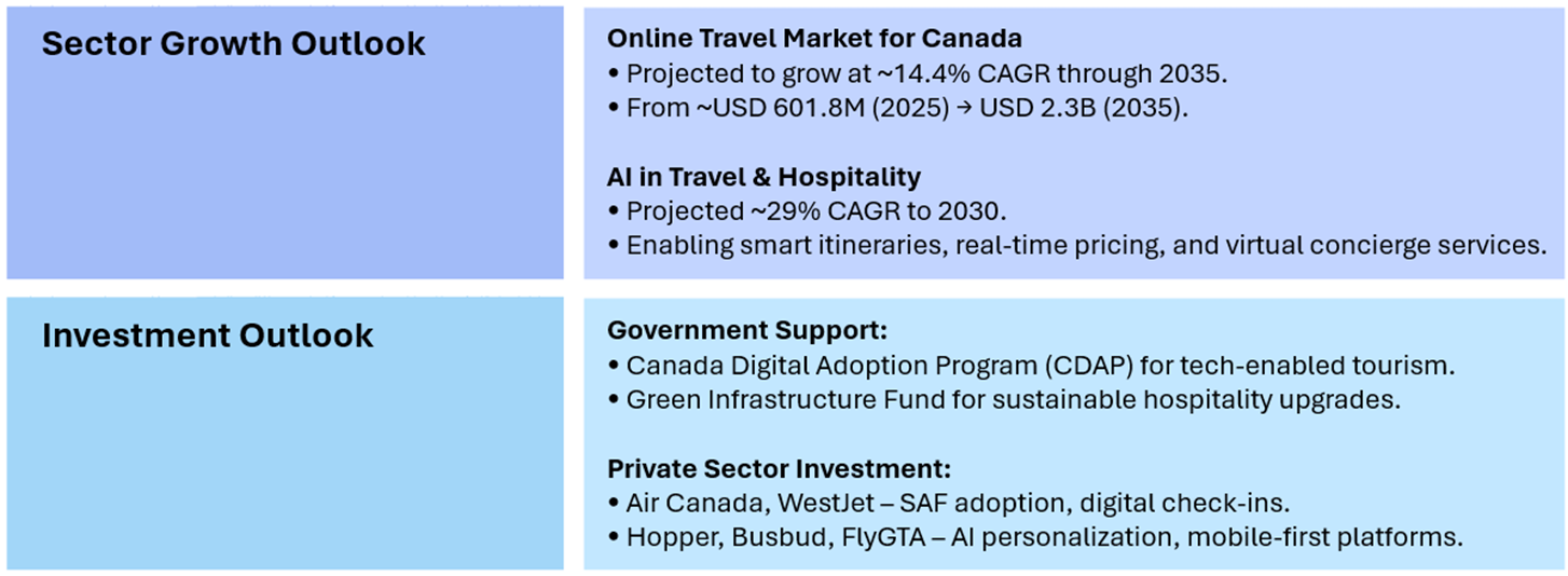 Canada's Travel and Leisure sector in 2025 is resilient and growth-oriented, driven by digital transformation (particularly AI integration), a decent push for sustainability, favorable government policies, and renewed demand from both domestic and international travelers. The sector spans a diverse value chain including airlines, hotels, digital travel platforms, entertainment, gaming, casinos, retail, and consumer discretionary, each playing a vital role in reshaping travel experiences. Growth is further fueled by rising immigration, increased urban mobility, and a shift toward personalized, health-secure, and eco-conscious travel. While challenges like labor shortages, infrastructure gaps, and regulatory uncertainties remain, the sector’s outlook remains positive, hinging on its ability to scale innovation, attract investment, and expand capacity.